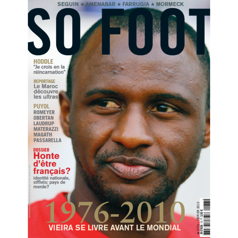 Un numéro fort et introspectif, porté par la parole rare de Patrick Vieira, qui se confie à So Foot à la veille du Mondial 2010. De ses débuts à Cannes à son parcours en Bleu, le champion du monde 1998 revient sur ses blessures, ses fiertés, Arsenal et son rapport à la France. Dans un contexte de crise identitaire, So Foot pose aussi la question qui fâche : “Honte d’être français ?” Un dossier brûlant sur l’identité nationale, les sifflets, les clichés et le malaise d’un pays qui doute. Autour de ce thème, le magazine déroule ses habituelles pépites :