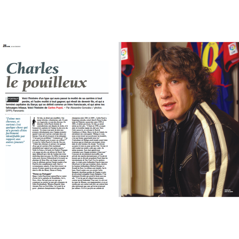 un portrait de Carles Puyol, capitaine du Barça qui porte les cheveux dans les yeux