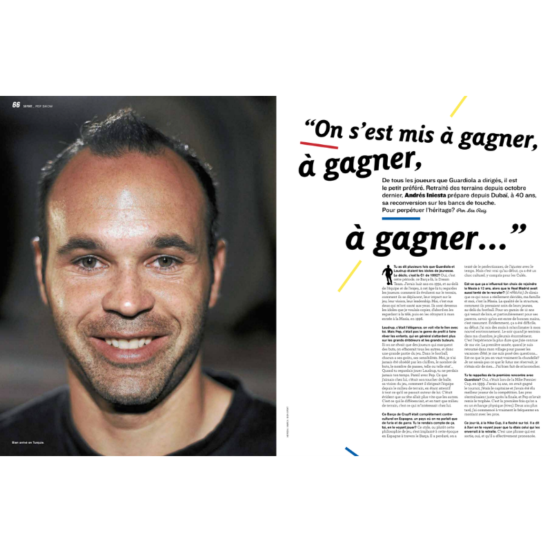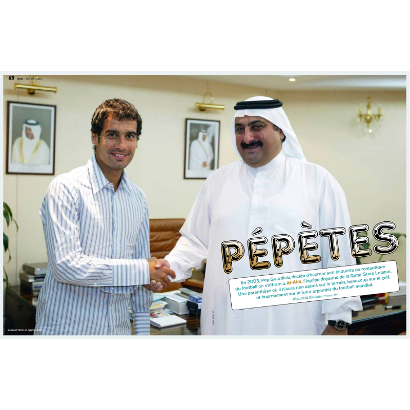 Ce premier opus exceptionnel de 100 pages vous emmène en reportage dans le village d'enfance de Guardiola, àSantpedor, où il était le fils du maçon. Vous retrouverez aussi un entretien où Pep parle en long, en large et en travers de son mentor : Johan Cruyff. Préparez vous également à plonger dans la grande odyssée de Guardiola au Barça. Mais aussi... un entretien tiki-taka avec Iniesta, petit chouchou de Guardiola ; un article sur ses années à Brescia, la “meilleure période de sa vie” ; un reportage dans le Sinaloa, en plein fief du cartel de drogue le plus puissant au monde, où Guardiola a mis fin à sa carrière (ou plutôt entamé sa reconversion)...