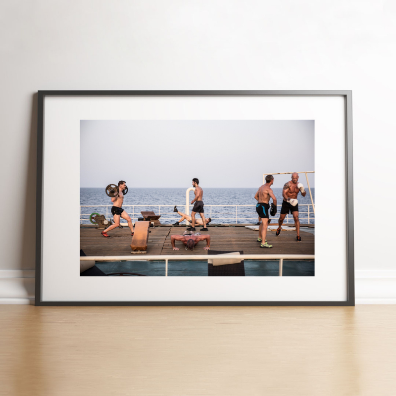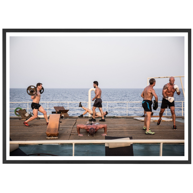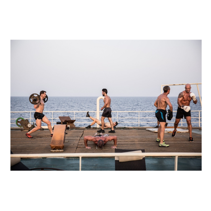 Scène de la vie de tous les jours sur les armureries flottantes des mers Rouge, d’Arabie ou du golfe d’Oman. Remplies d’armes et de gardes privés, elles proposent aux pétroliers et autres tankers de louer du personnel de sécurité et des munitions pour se défendre contre les pirates. Alors pour s'entretenir et, aussi, passer le temps, ces hommes s'adonnent à des séances quotidiennes de gym et muscu sur le pont du bateau.