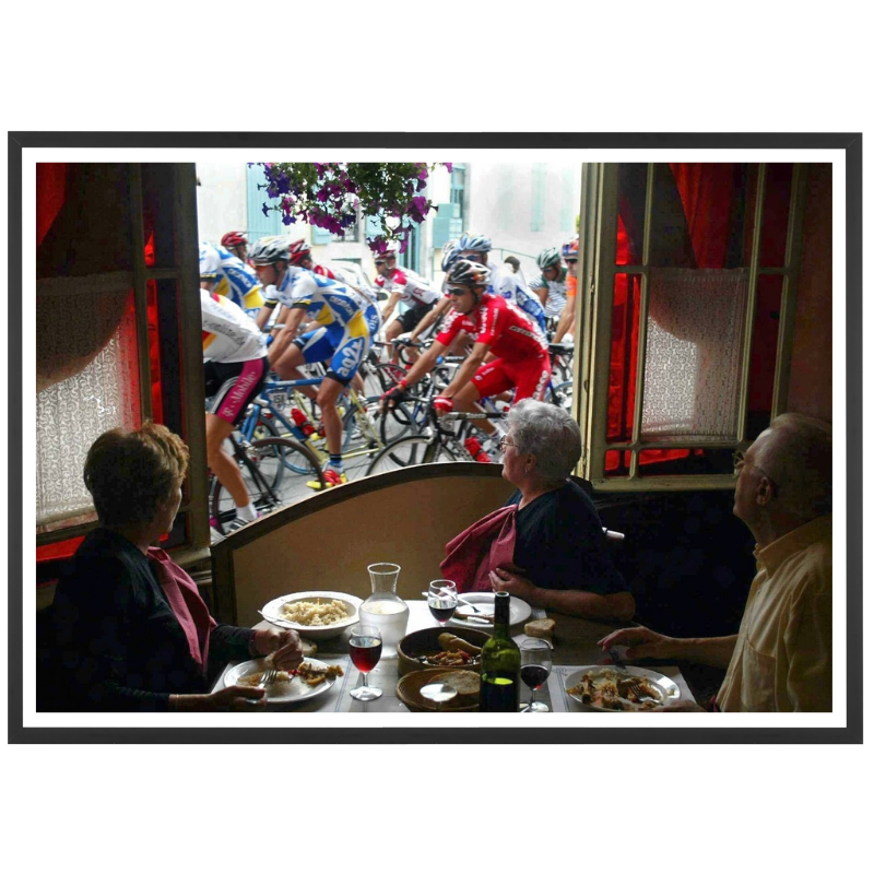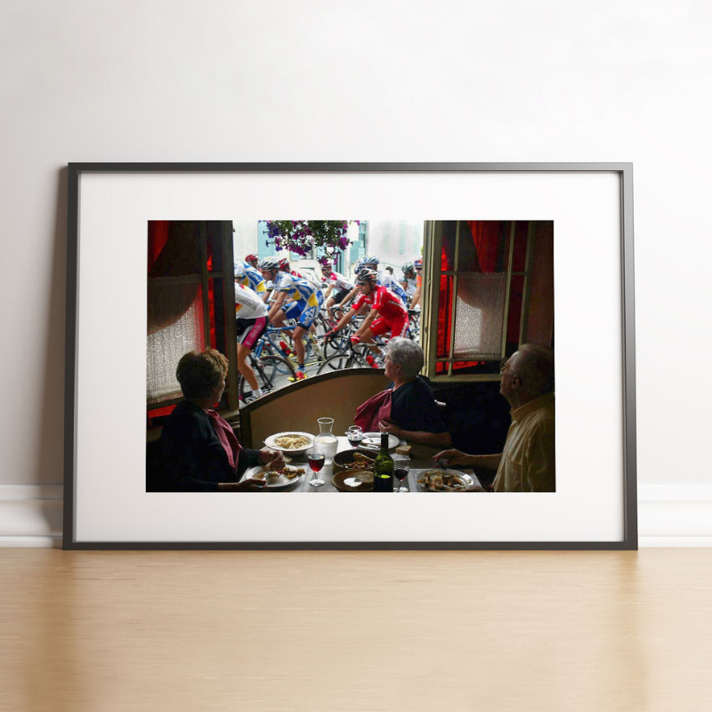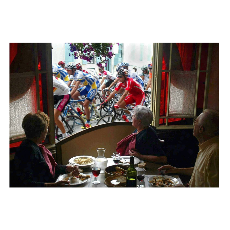 Deux femmes et un homme déjeunent en regardant, par la fenêtre, le peloton passer dans la rue