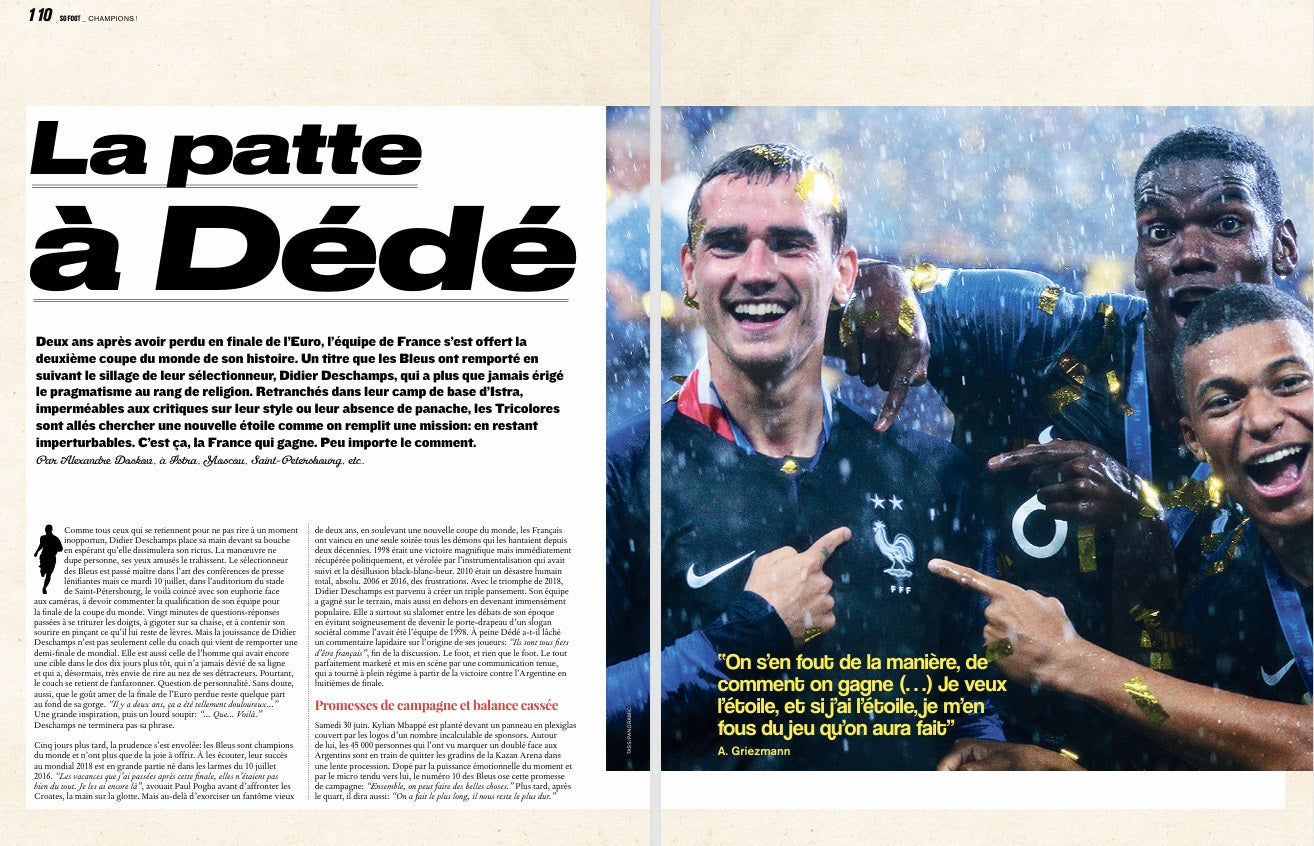 • DÉCRYPTAGE : la patte à Dédé. Deux ans après avoir perdu en finale de l’Euro, l’équipe de France s’est offert la deuxième coupe du monde de son histoire en suivant le sillage de Didier Deschamps, qui a plus que jamais érigé le pragmatisme au rang de religion. C’est ça, la France qui gagne. Peu importe le comment.