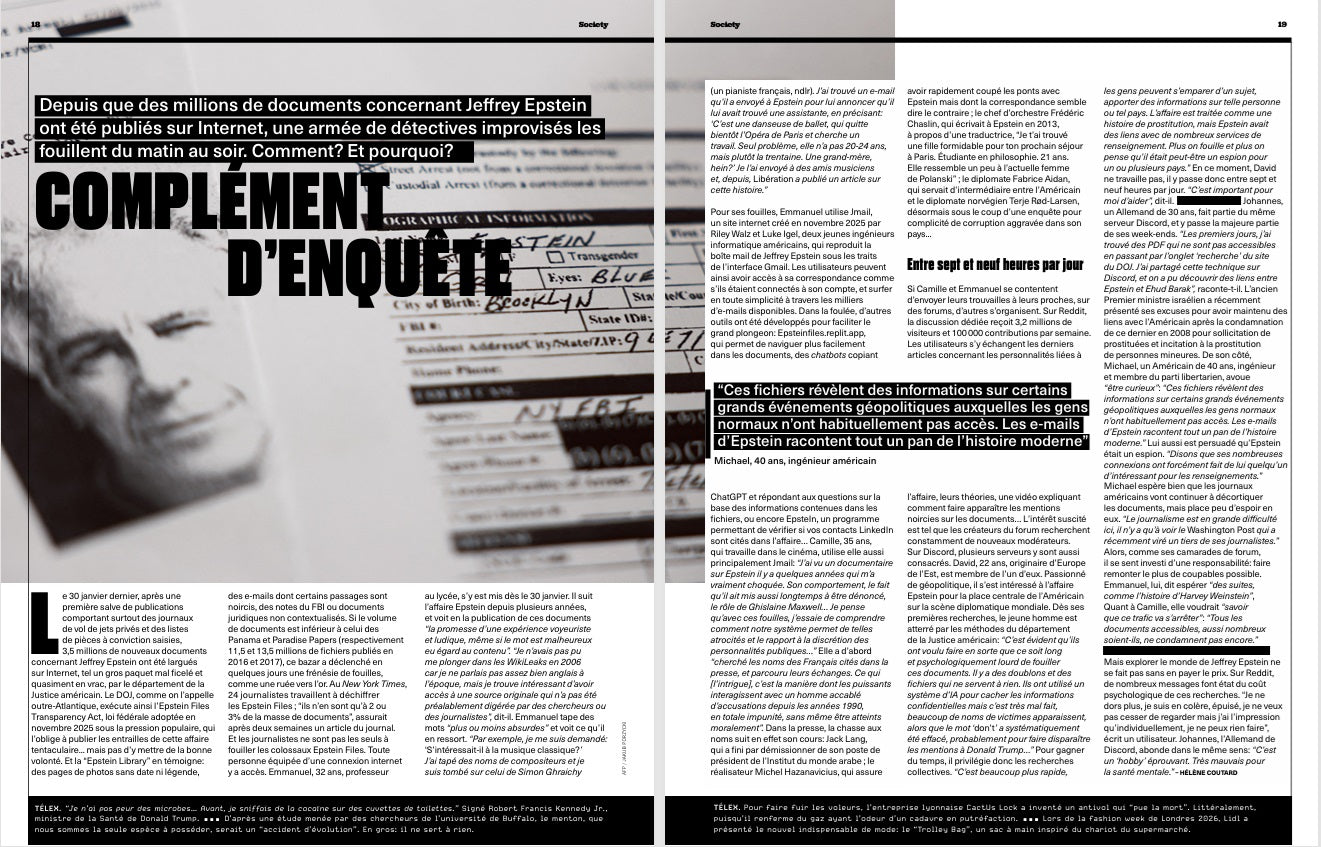 Retrouvez aussi : immersion avec les enquêteurs amateurs de l’affaire Epstein ; guerre des réseaux autour des municipales à Paris, et longue glissade de Jean-Michel Aulas pour celles de Lyon ; la vraie histoire du vrai « Marty Supreme » ; entretien avec Hugo Sélignac, le producteur le plus chaud du moment ; un reportage avec la confrérie de bikers des Bandidos ; les jeunes New-Yorkais qui retournent à la messe ; et une baston de bar qui dégénère en règlement de comptes généralisé dans un village du Pays basque.