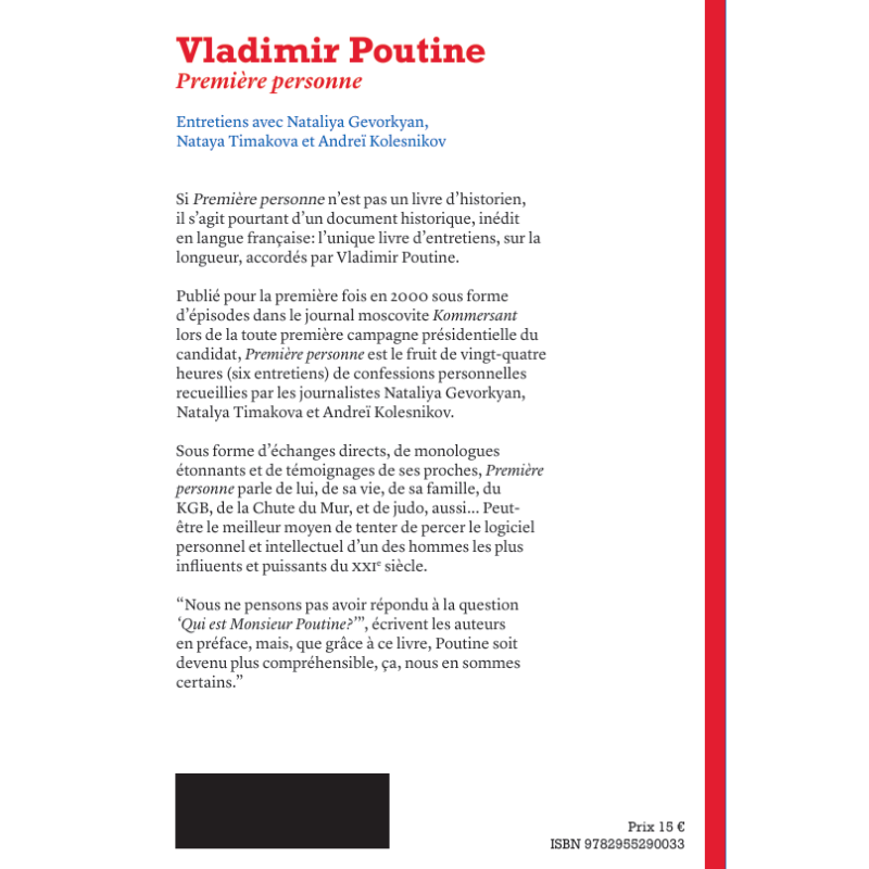 Publié pour la première fois en 2000 sous forme d’épisodes dans le journal moscovite Kommersant lors de la toute première campagne présidentielle du candidat, PREMIÈRE PERSONNE est le fruit de vingt-quatre heures (six entretiens) de confessions personnelles recueillies par les journalistes Nataliya Gevorkyan, Natalya Timakova et Andreï Kolesnikov.