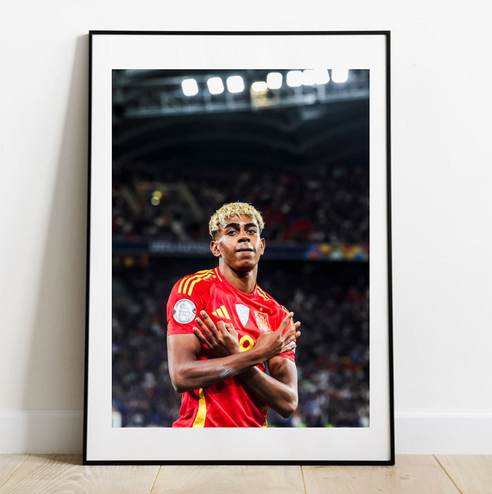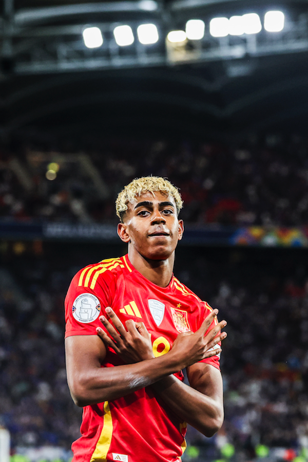 Image forte du prodige espagnol célébrant son deuxième but lors d’un grand rendez-vous international. Une photographie emblématique de l’émergence de Lamine Yamal au plus haut niveau du football européen.