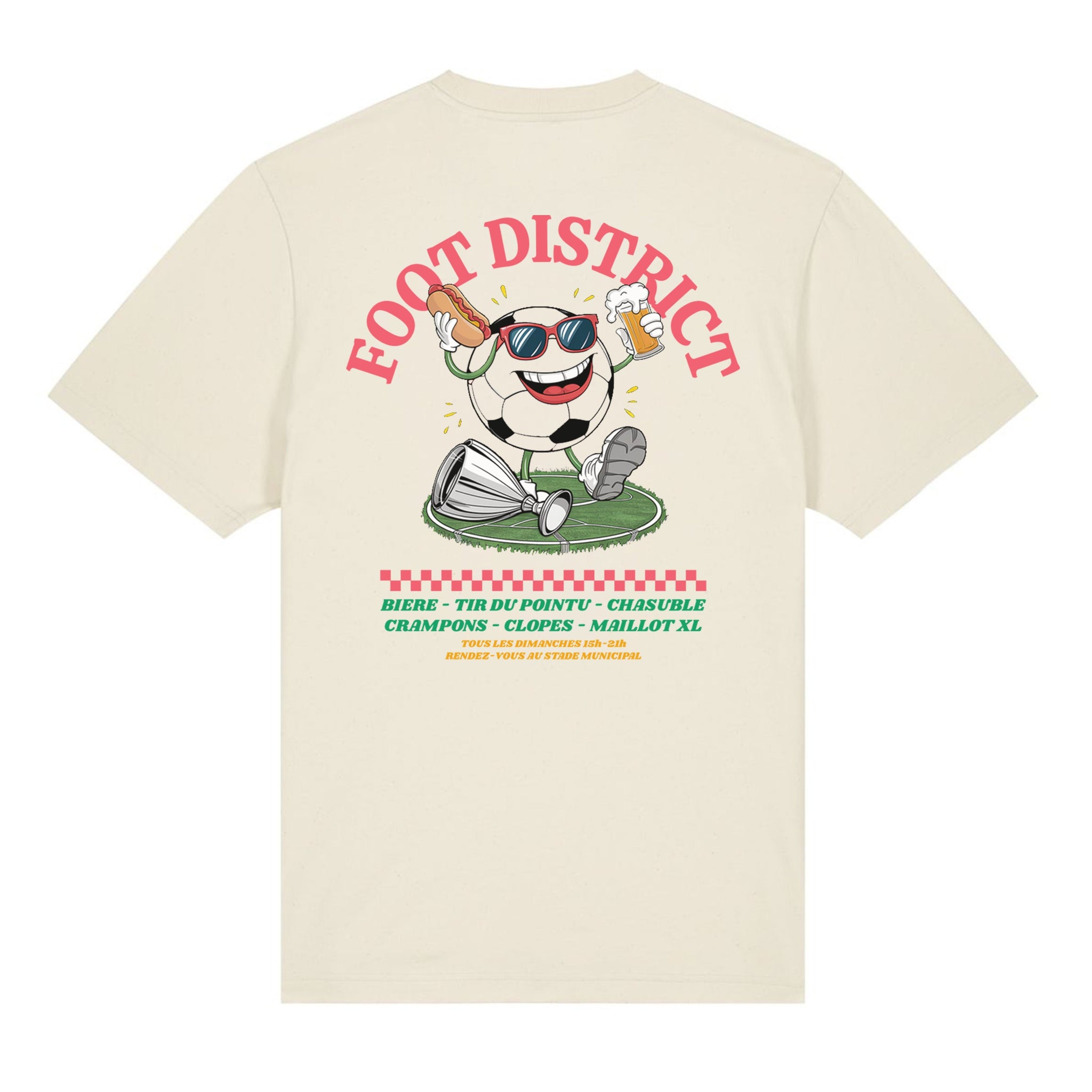 Bière, tir du pointu, chasuble, crampons, clopes, maillots XL... Ce t-shirt en collaboration avec le shop Foot Dimanche célèbre les plaisirs du football dans les divisions de district. Et vous permettra de briller lors des innombrables troisièmes mi-temps à la buvette du club-house cette saison.
