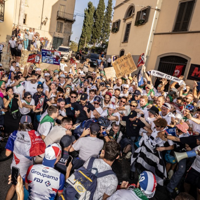 Moment où Thibaut Pinot passe dans la Curva à son nom, montée par ses fans du Collectif Ultras Pinot (CUP), pour la dernière course de sa carrière
