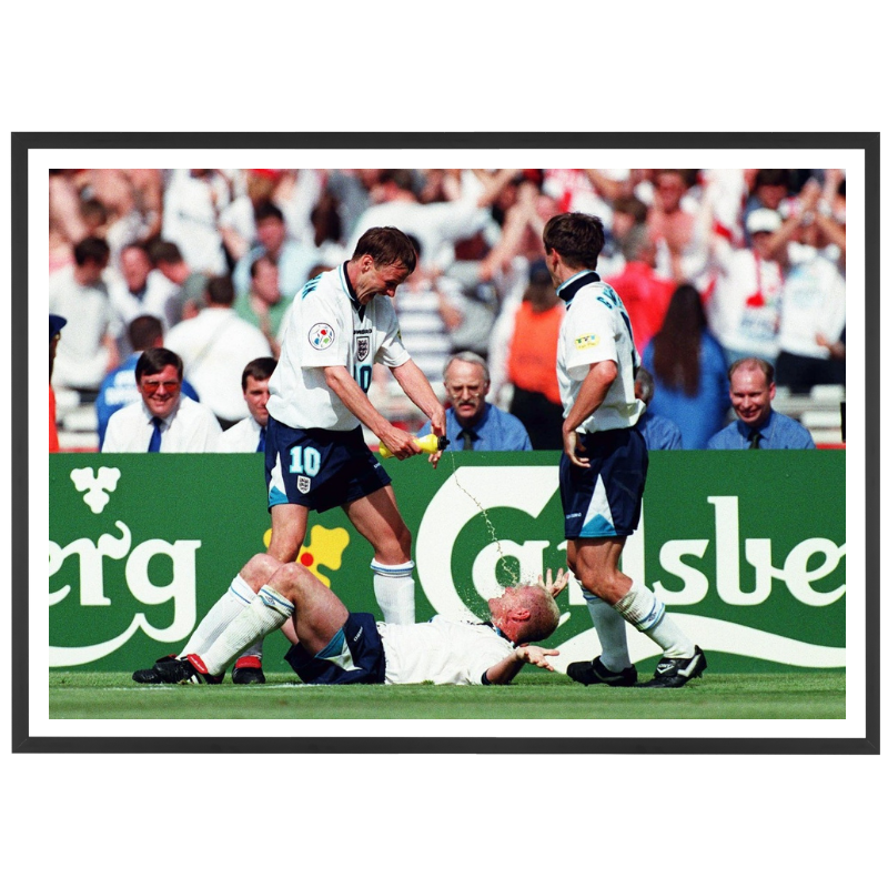 Paul Gascoigne aspergé d'eau par son coéquipier Teddy Sheringam devant les yeux de Gary Neville lors de la fameuse célébration de la "Chaise du Dentiste", clin d'oeil à une photo prise à Hong Kong lors d'une beuverie le mois précédent la compétition...
