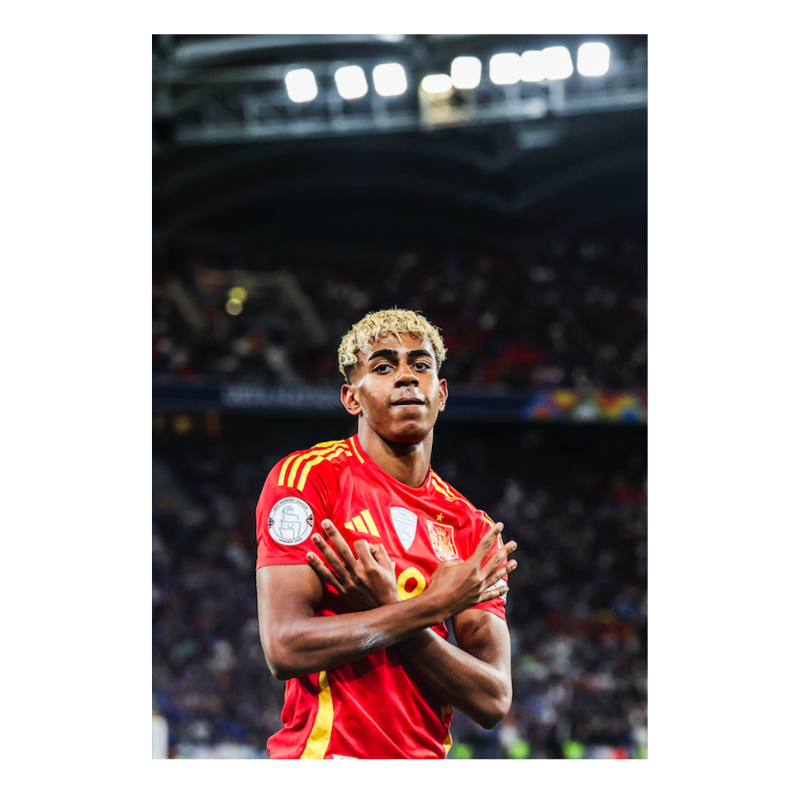 Image forte du prodige espagnol célébrant son deuxième but lors d’un grand rendez-vous international. Une photographie emblématique de l’émergence de Lamine Yamal au plus haut niveau du football européen.