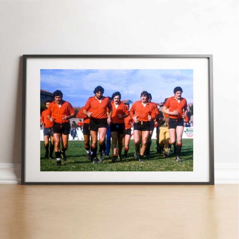 Image rare et emblématique des frères Spanghero réunis lors d’une séance d’entraînement à Narbonne. Une photographie forte du rugby français des années 1970, symbole de puissance, de fraternité et d'un âge fantasmé du rugby tricolore.