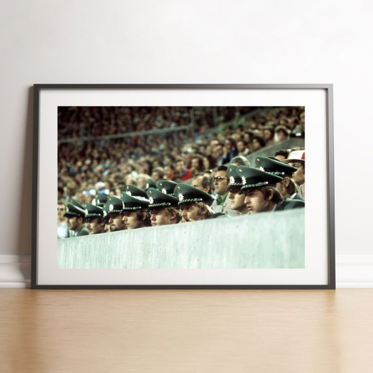 Agenti di polizia tedeschi assistono a una partita della Coppa del Mondo, 1974