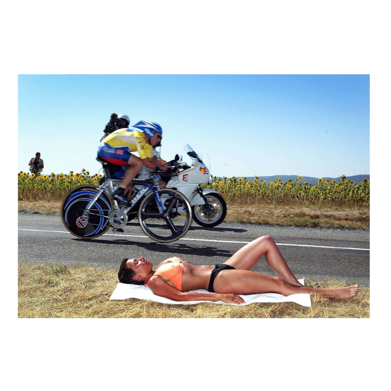 Uno spettatore prende il sole lungo le strade del Tour de France mentre Lance Armstrong (US Postal), in maglia gialla, completa una cronometro (sconfitto quel giorno da Jan Ullrich).