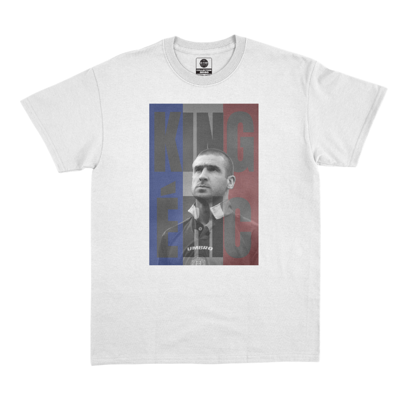 Crâne rasé, regard droit et col relevé : Eric Cantona version sélectionneur des Bleus de l’imaginaire collectif. Une gueule, une attitude et une présence qui suffisent à raconter toute une époque du football français.